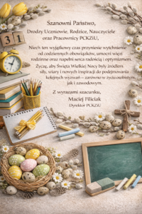 Niech ten wyjątkowy czas przyniesie wytchnienie od codziennych obowiązków, umocni więzi rodzinne oraz napełni serca radością i optymizmem. Życzę, aby Święta Wielkiej Nocy były źródłem siły, wiary i nowych inspiracji do podejmowania kolejnych wyzwań – zarówno w życiu osobistym, jak i zawodowym.
